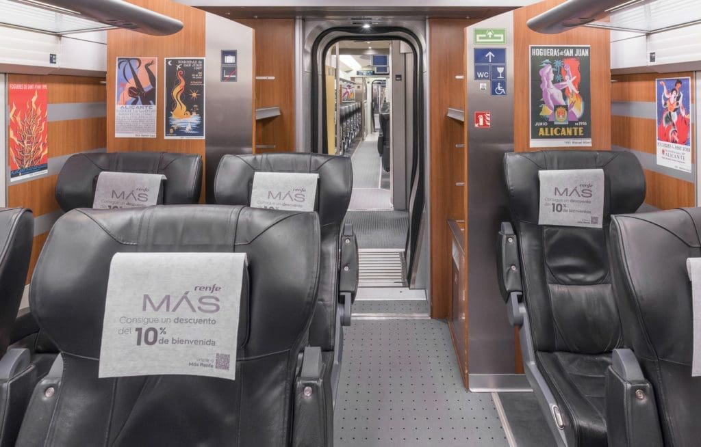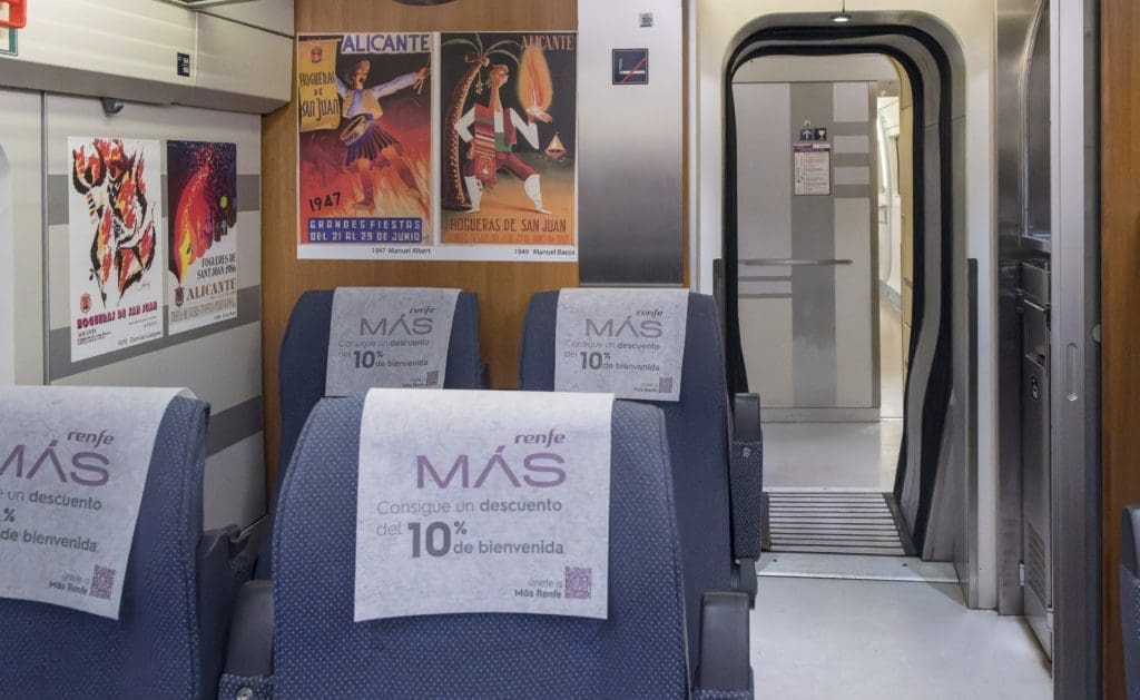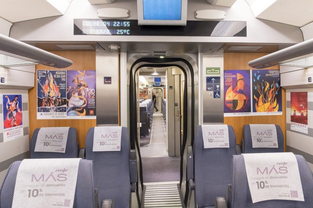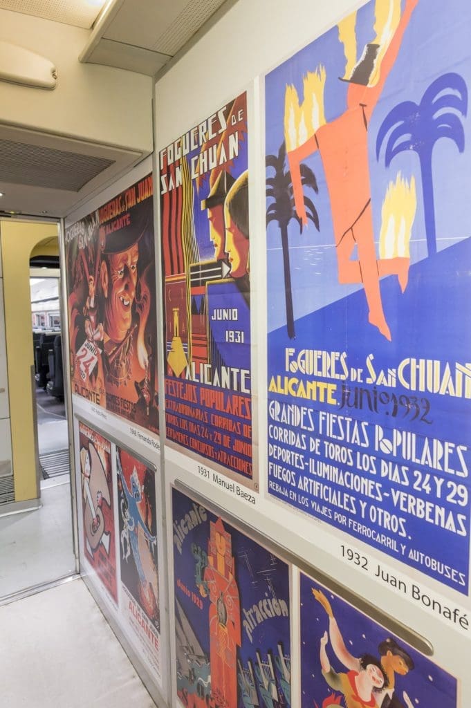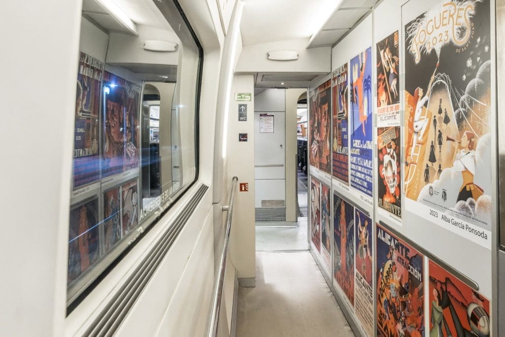 Renfe y la Federació de les Fogueres de Sant Joan presentan desde hoy una selección de casi un centenar de fotografías del mundo de las Hogueras a través de sus carteles en el interior de un tren AVE Alicante-Madrid.