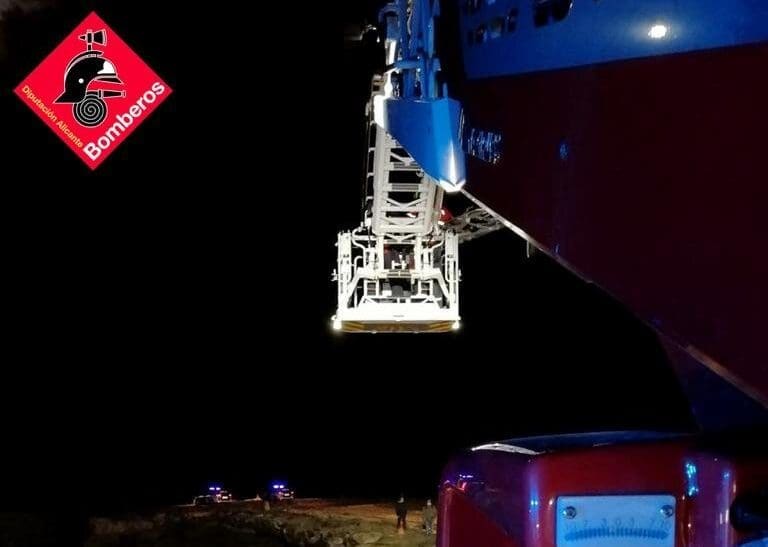 Los bomberos le rescatan en una cesta (camilla) de la escalera de bomberos utilizada a la inversa (hacia abajo). Al haber estado 40 min en el agua y salir por una zona de rocas, el hombre necesitó asistencia sanitaria por hipotermia, así como varias rozaduras y cortes.