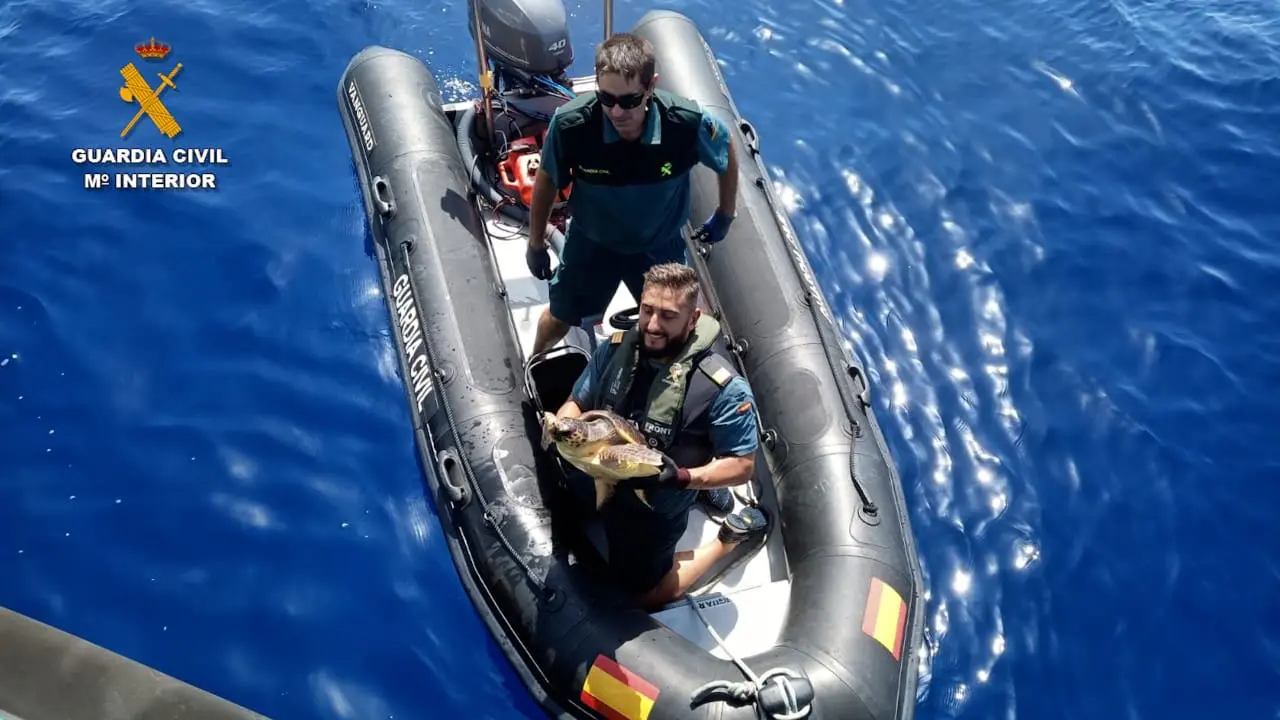 La Guardia Civil de Alicante ha rescatado una tortuga de la especie Caretta caretta que se encontraba enganchada en un conjunto de botellas de plástico empleadas, probablemente, para señalizar artes de pesca ilegales.
