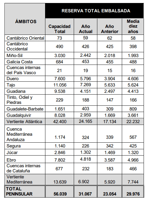 Los embalses almacenan actualmente 31.067 hectómetros cúbicos (hm³) de agua, disminuyendo en la última semana en 1.000 hectómetros cúbicos (el 1,8% de la capacidad total actual de los embalses).