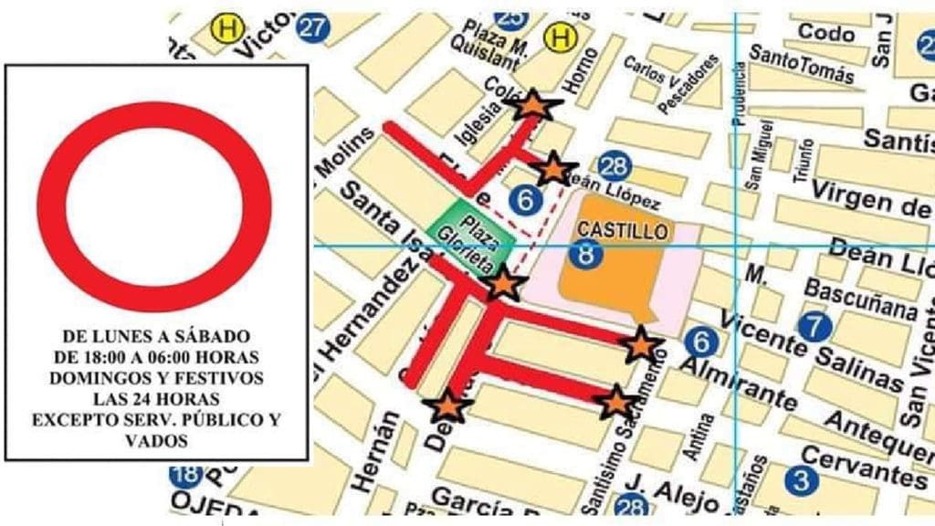 El tramo interno que discurre por la fachada delantera del Castillo y zona central de la Glorieta quedará totalmente cerrado al paso de vehículos, siendo únicamente los destinados a servicios públicos y los que sean permitidos de forma expresa y puntual por las fuerzas de seguridad quienes podrán circular por ese vial, siendo propuestos para denuncia aquellos vehículos que transiten sin cumplir las condiciones.