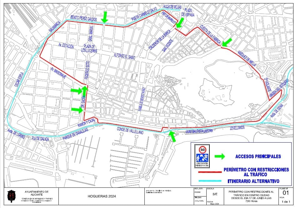 El dispositivo especial de tráfico y transportes con motivo de la celebración de las fiestas de Hogueras 2024 arranca de forma oficial este lunes, 17 de junio, a las 7:00 horas y se prolongará hasta el 25 de junio, a las 8:00 horas, con el establecimiento de un circuito restringido al tráfico para permitir la plantá de los monumentos en las distintas calles del municipio.