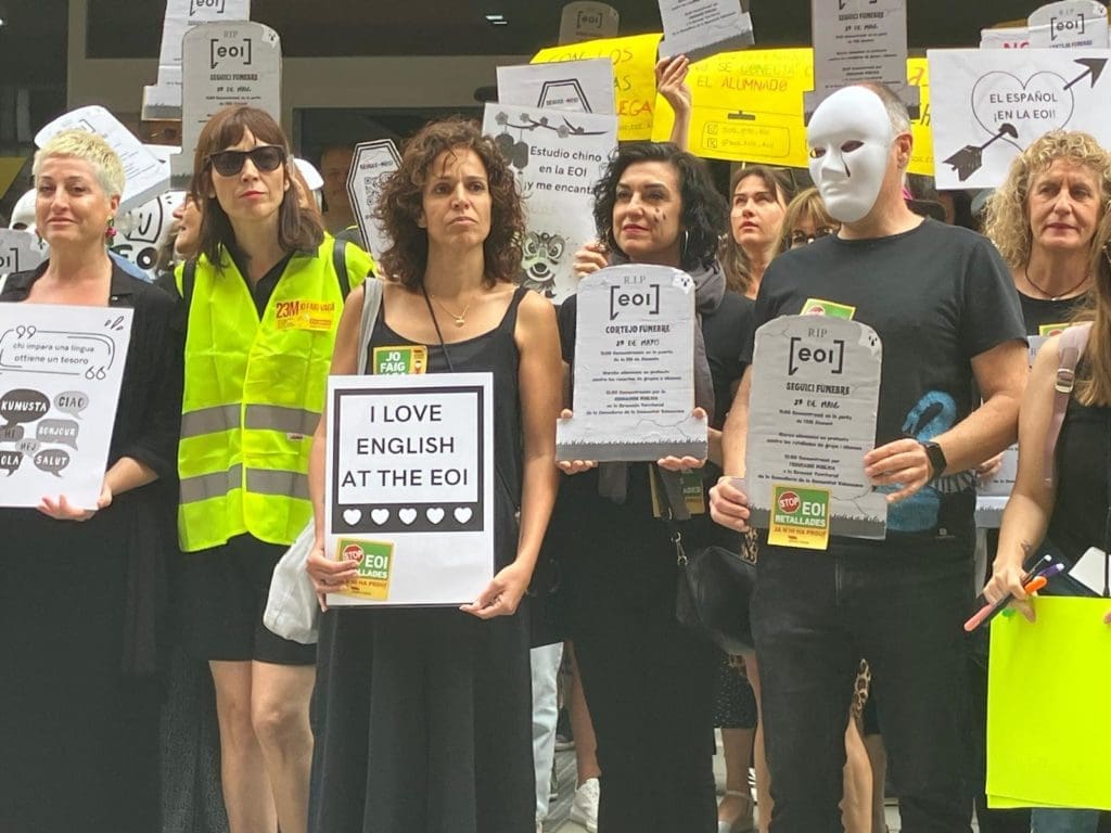 En el camino, un megáfono explicaba el descenso de plazas en cada uno de los idiomas que se imparten en el centro. En el caso de Alicante, desaparece el euskera, que solo se impartirá presencialmente en València y online para el resto de alumnos. También los cursos de español para extranjeros, que suelen tener lista de espera, pasarán de 24 grupos a 13, explica el jefe de Estudios David Navarro.