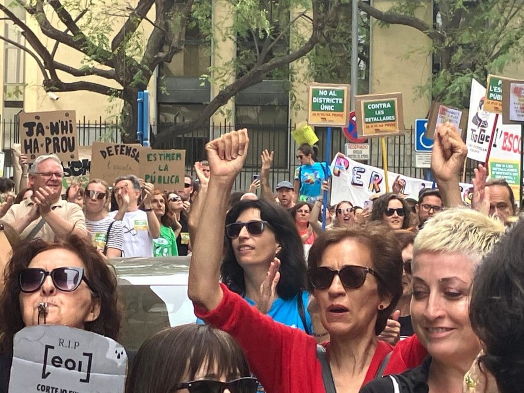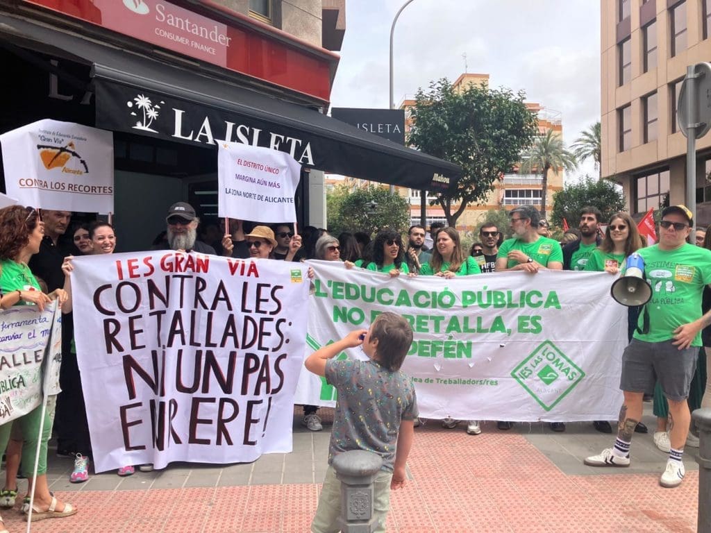 El primero de los dos pulsos del día de los colectivos educativos englobados en la Plataforma per l’Ensenyament Públic para protestar contra recortes educativos y las leyes de Distrito Único y de Libertad Lingüística ha tenido lugar con concentraciones en distintos puntos de la Comunitat. En Alicante, con una convocatoria que ha reunido en torno a 2.000 personas, según organizadores, en la puerta de la Dirección Territorial de Educación, antesala de la manifestación que partirá a las 18 horas de las escaleras del IES Jorge Juan.