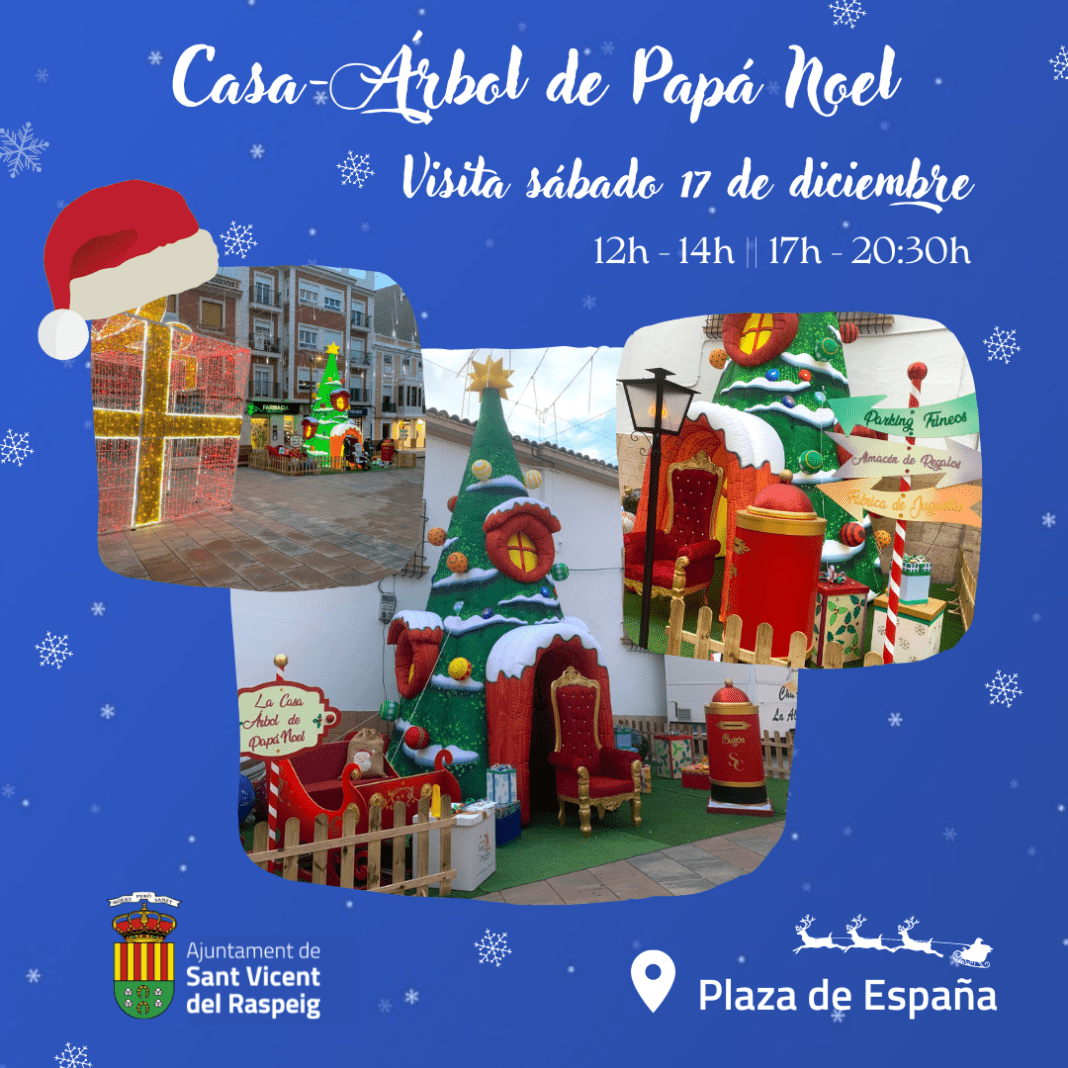 La emoción y el ambiente mágico inunda San Vicente del Raspeig con la inauguración mañana sábado 17 de diciembre de la Casa -árbol de Papá Noel, y a la que los más pequeños podrán acudir a visitar a Santa Claus. La casa estará situada en la Plaza de España y la visita se podrá realizar el mismo sábado 17, de 12:00 a 14:00 horas y de 17:00 a 20:30 horas.