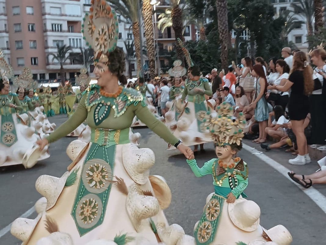 Entre ellos, los de la Hoguera Polígono de Babel-Bernardo Pérez Sales, con «Aires de papel» portaban trajes con una treintena de pai pais de papel de periódico en homenaje a la prensa y «valorar la información», explicaba su presidenta, Encarna Alemañ. «Ha sido cuestión de doblar y doblar papelito y de graparlos». Un trabajo que en el caso de los gorros ha llevado también su complejidad. «El trabajo de los gorros de los chicos increíble porque porque todo está hecho con cartón. Algunos sí que tienen base de una chistera, pero otros son todos hechos de cartón. todos muy bien y todos cerrados».