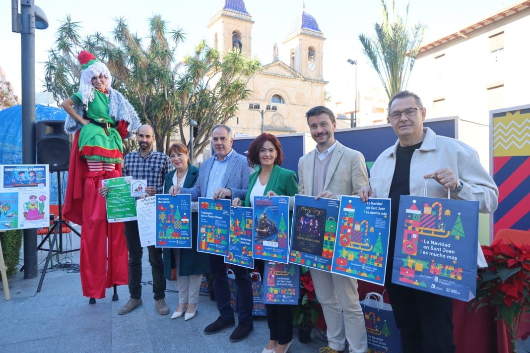 Esta mañana, en la misma Plaza de España donde ya se ha empezado a instalar parte de la decoración e iluminación navideña, se han presentado todas las actividades navideñas que durante los próximos días estarán organizadas por las Concejalías de Comercio, Fiestas, Mayores, Cultura, Juventud y Educación. En la rueda de prensa han intervenido el alcalde de Sant Joan, Santiago Román, y los concejales de Fiestas, Charo Tomás; Comercio, Manuel Nieto; Mayores, Carmen Navarro; Educación y Servicios Sociales, Marcos Piña; y Cultura y Juventud, David Aracil. Le sha acompañado una zancuda vestida de elfo.