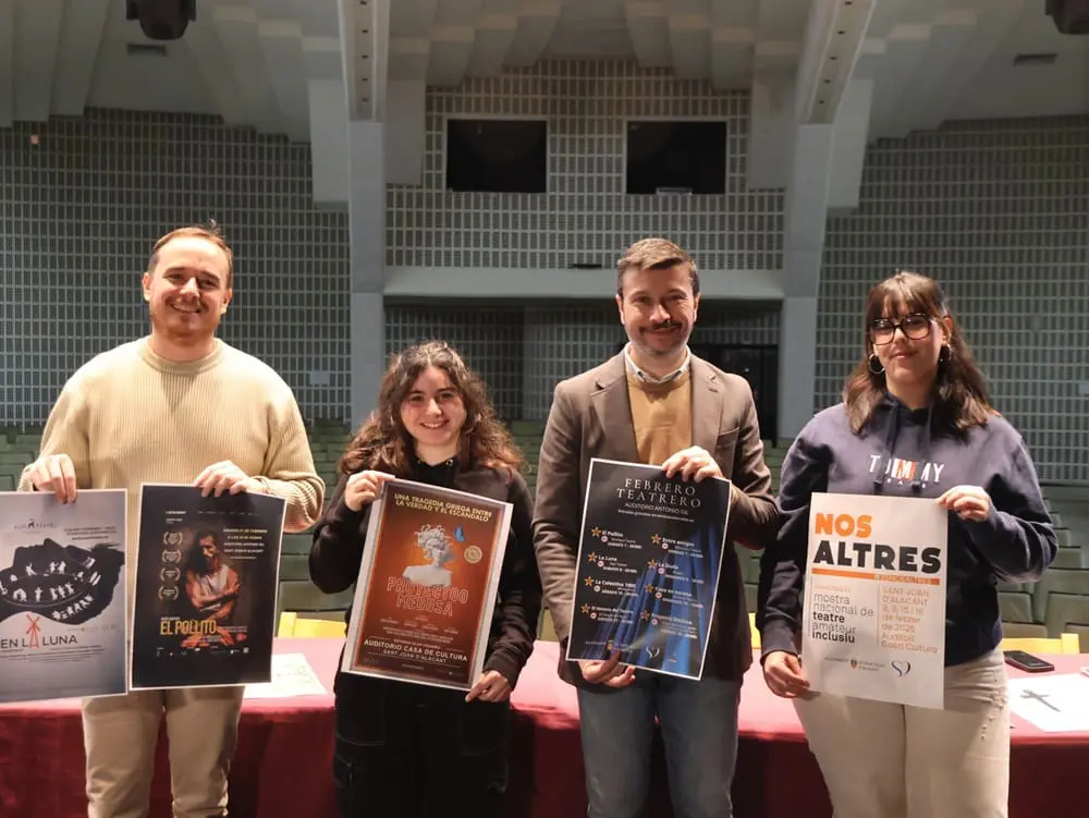 Bajo el título ‘Febrero Teatrero’, el Auditorio ‘Antonio Gil’ de la Casa de Cultura de Sant Joan d’Alacant abrirá el telón ocho veces en el mismo mes para ofrecer espectáculos de artes escénicas. La Concejalía de Cultura ha programado un ciclo teatral, desde el 1 hasta el 28 de febrero, con la participación de dos grupos teatrales locales, el estreno del Taller de Teatro Joven, la función de una compañía madrileña y la tercera edición de la Muestra Nacional de Teatro Amateur Inclusivo NOSaltres. Ocho funciones todas gratuitas, de temáticas y géneros diversos y dirigidas a público amplio.
