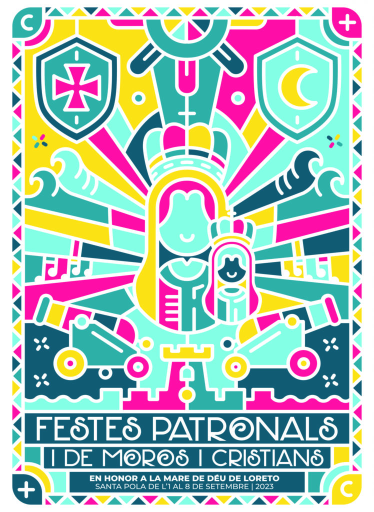 Santiago Buades Blasco quiso explicar el porqué de su peculiar y colorido diseño, en el que aparecen todos los símbolos de nuestra fiesta. “Lo bueno que tiene el arte es que cada persona coge una obra y la hace suya”, refiriéndose a las diferentes interpretaciones que se puede hacer de los símbolos reflejados en el cartel: los estandartes moros y cristianos, el timón de los pescadores, los cañones, el castillo, las notas musicales, la Virgen de Loreto… “Para mí esos colores representan la esencia mediterránea”.