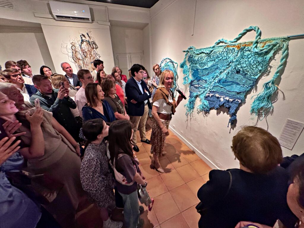 La muestra convierte el paisaje mediterráneo en una memoria material y emocional. A través de tapices elaborados con cabos marineros usados, cañas, madera y fibras naturales, la artista construye una propuesta inspirada en el mar, las salinas y la arquitectura costera.
