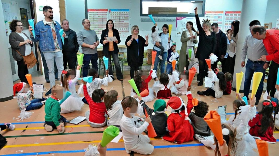 La alcaldesa Loreto Serrano y el patrón mayor José López han sido hoy la cabecilla del grupo y se han pasado por todos los colegios para felicitar las fiestas a los niños y entregarles su regalo navideño, que es muy esperado por todos pese a la humildad del presente.