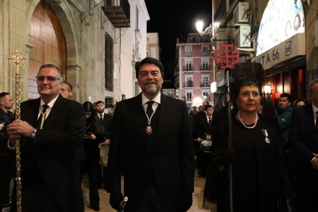 La comitiva la ha presidido el alcalde Luis Barcala quien, al mismo tiempo, es Caballero de Honor del Santo Sepulcro. El primer edil ha recordado también la figura del centenario saetero, Juan Sempere, fallecido el pasado 17 de marzo: «Todavía recuerdo la expresión de inmensa alegría de su cara durante el homenaje que le tributó el Ayuntamiento al cumplir cien años. Ha sido, además, un excelente funcionario dedicado al servicio de los alicantinos durante varias décadas. Y quien con su arte, expresado en forma de saetas, muchas compuestas por él mismo, ha hecho que nos emocionemos en más de una ocasión». El primer edil ha estado acompañado por integrantes de la Corporación Municipal y por el presidente de la Junta Mayor de Hermandades y Cofradías, Alfredo Llopis.
