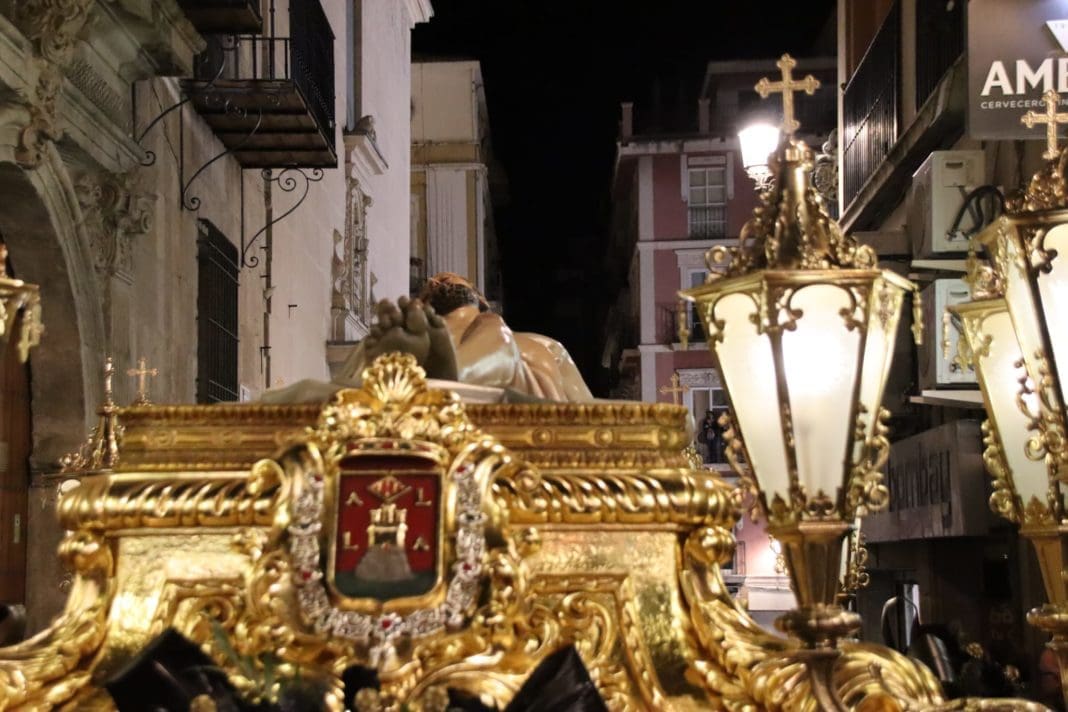 La siguiente hermandad en pasar por la Carrera Oficial ha sido la del Santo Sepulcro. La ha abierto la fanfarria de la banda de música de Ciudad de Asís, de Alicante. En el trono, restaurado el pasado año, se han podido apreciar con claridad los colores originales del de 1943 cuando esta hermandad procesionó por vez primera. En el cortejo se han podido ver a integrantes de los Caballeros del Santo Sepulcro de la Orden de Jerusalén, y a los Caballeros y Damas de Honor del Santo Sepulcro.