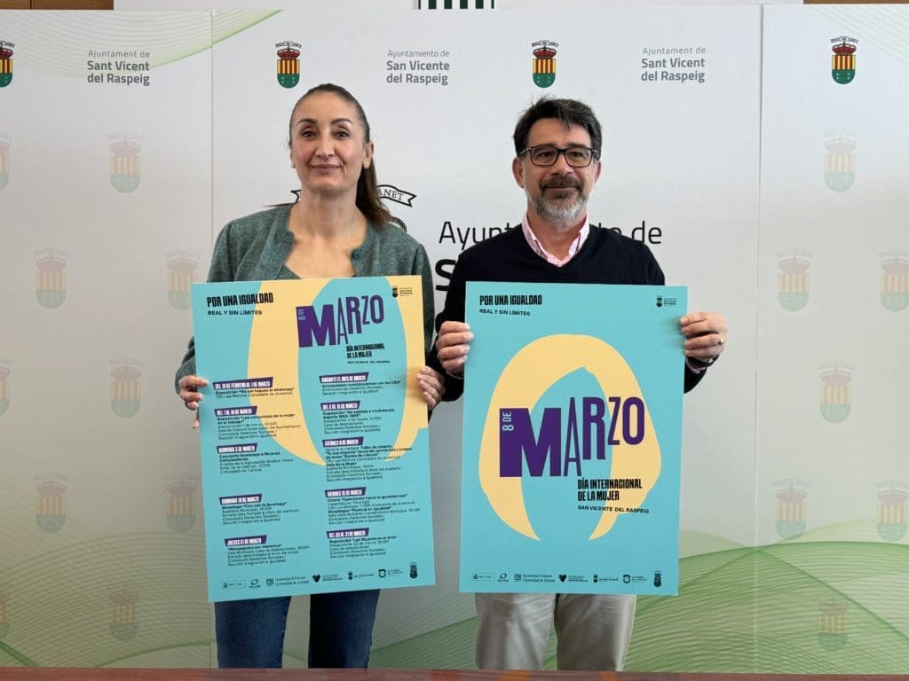 El alcalde, Pachi Pascual, y la concejal de Derechos Sociales, Mariela Torregrosa, han presentado la programación que se ha preparado desde el Ayuntamiento de San Vicente del Raspeig para conmemorar el 8 de marzo, Día Internacional de la Mujer.