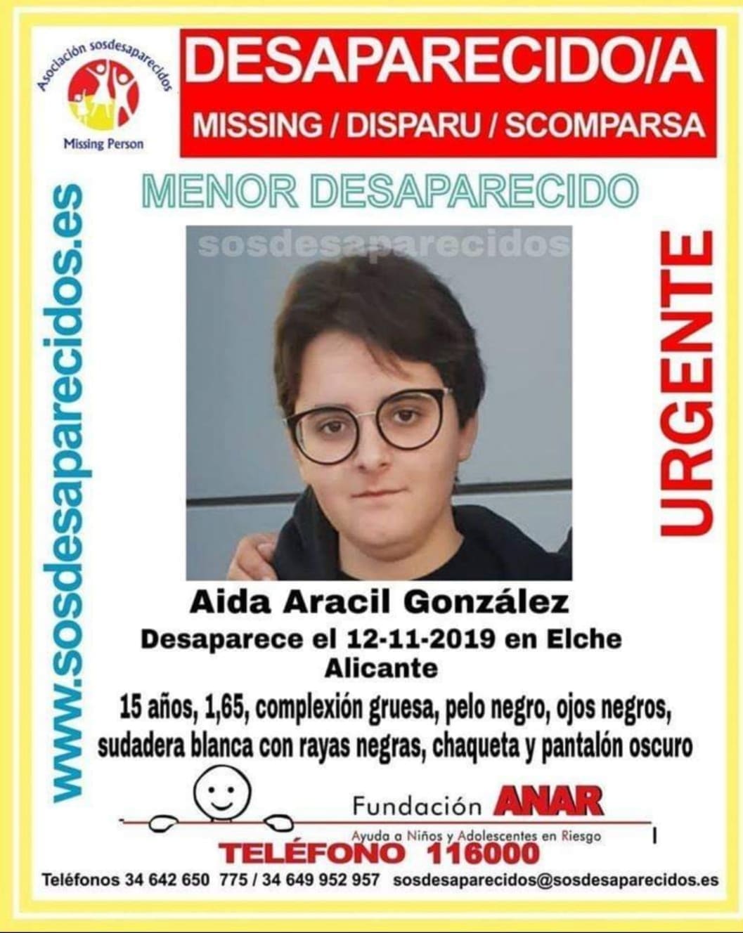 Aída Aracil González tiene 15 años, mide 1,65, tiene el pelo negro, los ojos oscuros y en el momento de la desaparición vestía con un pantalón oscuro, una sudadera a rayas y llevaba una chaqueta.