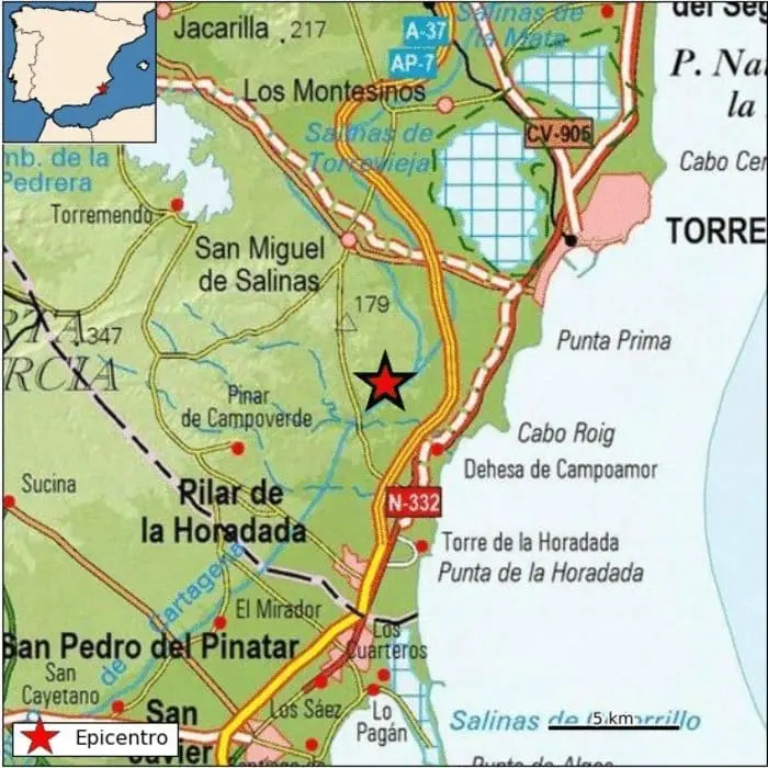 El terremoto se produjo este domingo a las 18.49 horas a una profundidad de 13 kilómetros y, según el IGN, se sintió además de en San Miguel de Salinas en Orihuela, Torrevieja, Almoradí y Rojales.