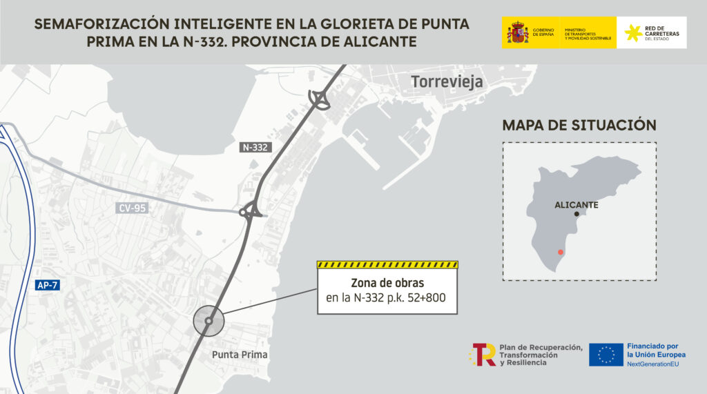El Ministerio de Transportes y Movilidad Sostenible inicia el próximo 30 de marzo las obras para instalar un sistema de semaforización inteligente en la glorieta de Punta Prima, situada en el punto kilométrico 52,8 de la N-332, en . La actuación incorpora tecnología basada en inteligencia artificial para adaptar la regulación del tráfico a las condiciones reales de circulación y mejorar la fluidez en uno de los accesos de esta vía.