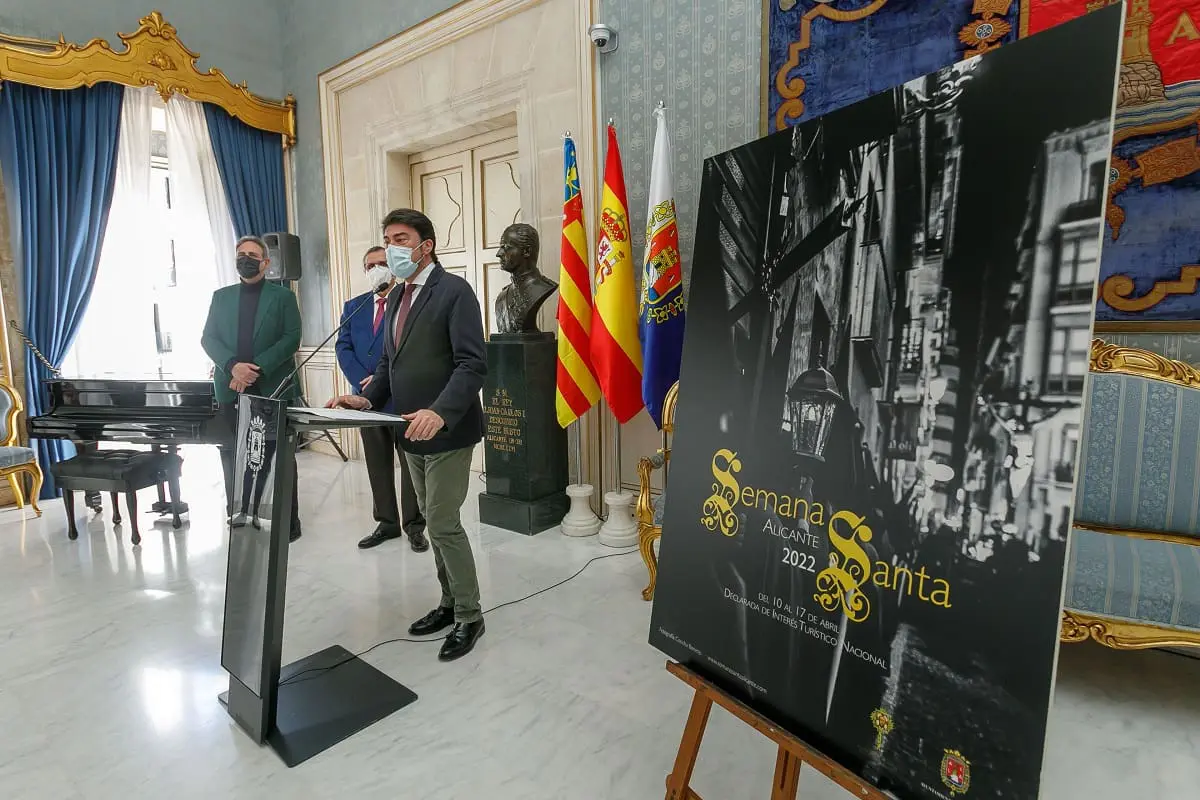 El acto se ha desarrollado en el Salón Azul del Ayuntamiento donde ha sido descubierto el cartel anunciador de la Semana Santa 2022, original de Concha Beneito. La imagen, propuesta por la Junta Mayor, de la primera Semana Santa de Alicante con la catalogación de Interés Turístico Nacional reproduce, en blanco y negro, el paso de la Procesión del Silencio por la calle Miguel Soler. Al fondo de la fotografía se aprecia el trono del Cristo de la Buena Muerte.