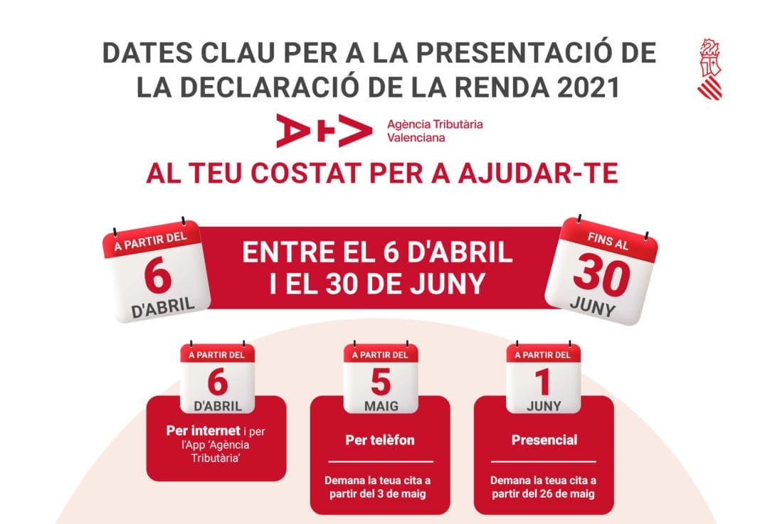 A partir del 6 de abril se inicia el plazo para que todas las personas obligadas a declarar puedan presentar su Declaración de la Renta 2021 a través de Internet, a través del servicio RentaWeb, mientras que a partir del 5 de mayo se inicia el servicio de atención personalizada telefónica y el 1 de junio arrancará, finalmente, la tramitación de forma presencial, para lo cual la Generalitat reforzará de nuevo sus servicios con la instalación de oficinas móviles y temporales en más de una veintena de municipios de toda la Comunitat, ofreciendo de forma gratuita la posibilidad de ayudar a los valencianos y valencianas a la elaboración de su renta.