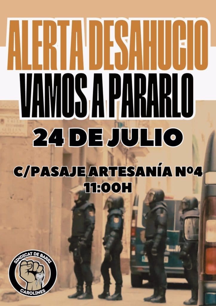 El Sindicat de Barri de Carolines se concentrará este miércoles 24 de julio para tratar de frenar el desahucio de un matrimonio y su hijo de seis años con alto grado de discapacidad, que no tienen alternativa habitacional.