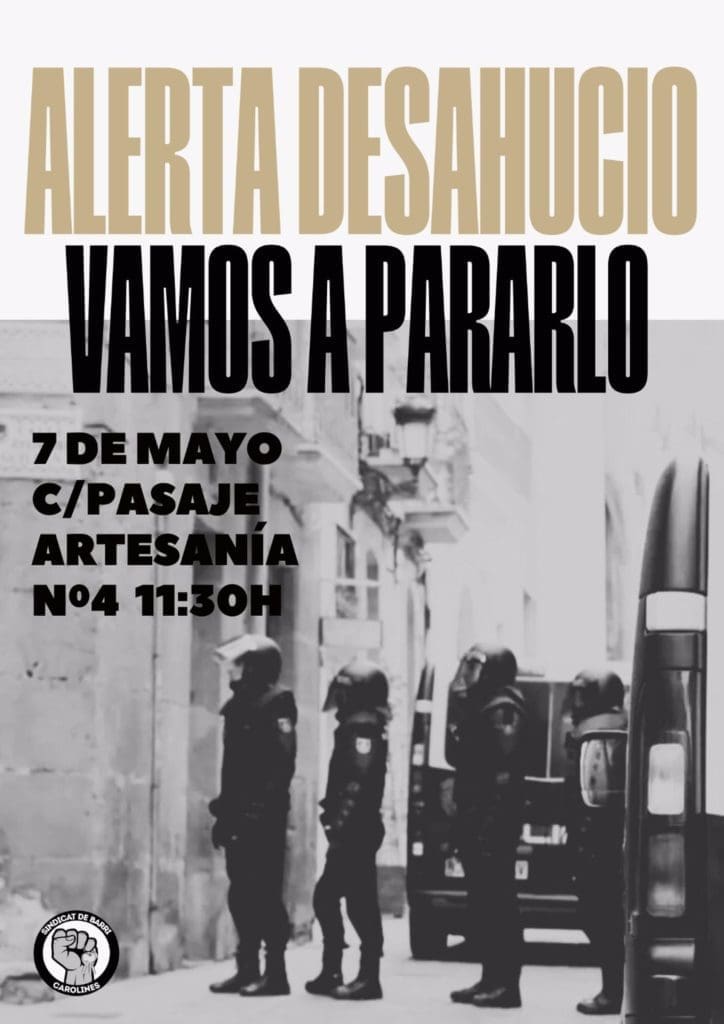 El Sindicat de Barri Carolines se concentrará el próximo martes 7 de mayo para tratar de impedir el desahucio de un matrimonio con un hijo de seis años con un alto grado de discapacidad, que «no tienen alternativa habitacional y corren el riesgo de quedarse en la calle».