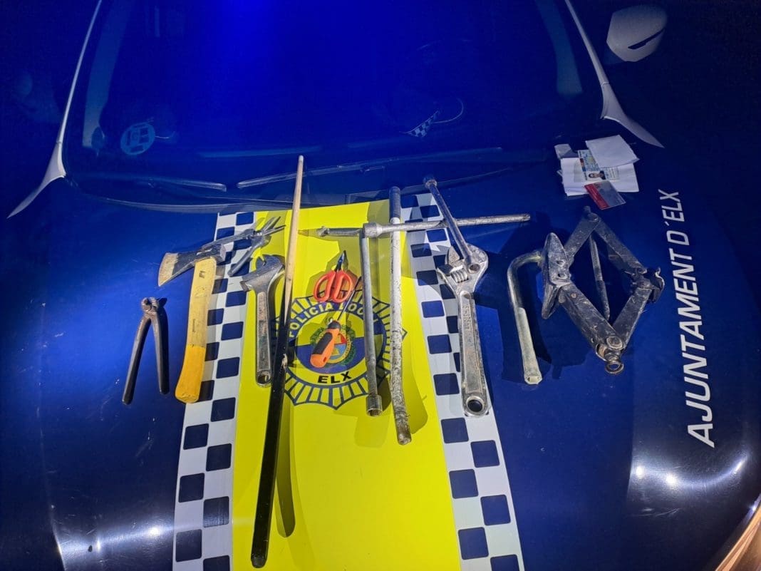 Al continuar con el registro, los policías encontraron escondido en el maletero: un gato mecánico, 3 tijeras de podar, 2 llaves inglesas de grandes dimensiones, 1 destornillador, 2 barras de hierro pesadas de unos 50 centímetros, unas mordazas de cortar alambre y un hacha. Todo el material fue intervenido.