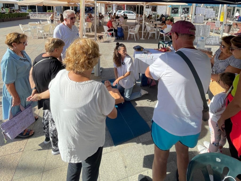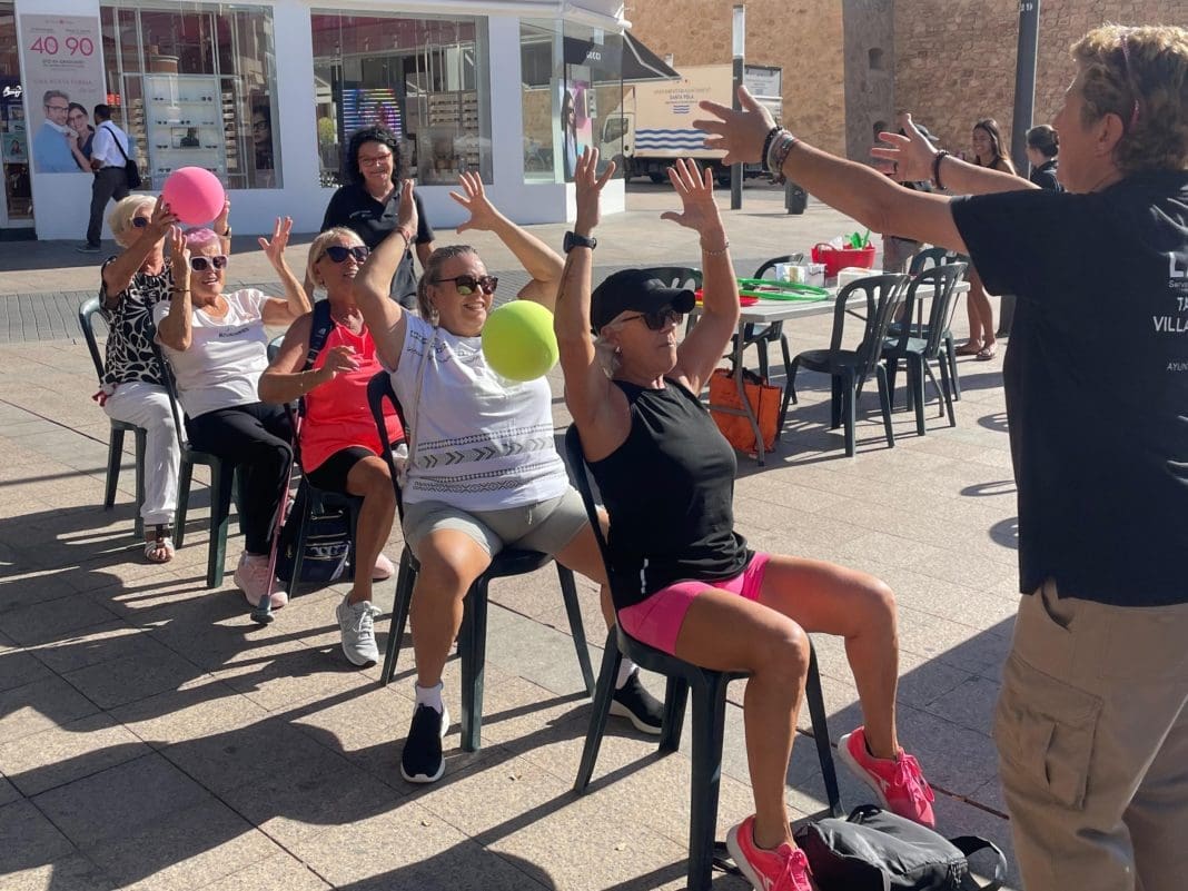 Esta mañana el taller de gimnasia que habitualmente se imparte en la playa de Levante se ha trasladado hasta la Glorieta, donde a las 10 ha comenzado una feria en la que se desarrollan diversas actividades de dinamización a cargo del Taller de Empleo, cribados de salud y prevención de caídas por alumnos del CEU Cardenal Herrera de Elche, taller de RCP por el Centro de Salud, presencia de la Guardia Civil para informar sobre las medidas del Plan Mayor, mesas informativas con actividades para personas mayores y otros recursos como Cruz Roja.