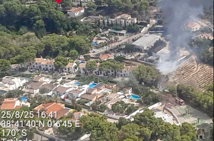 Un incendio forestal declarado este lunes por la tarde en la urbanización Adcocat de Teulada obligó a desalojar dos viviendas y desplegó un amplio dispositivo de emergencias por la proximidad de las llamas a las varias casas.