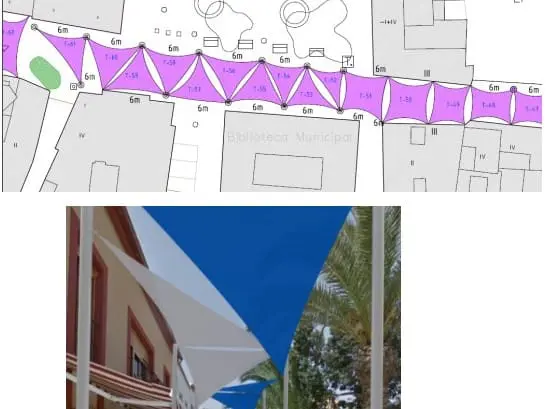 El proyecto contempla que el montaje de los toldos de tela de sombra será «de alta calidad», diseñados para estructuras de tensión y toldos de arquitectura comercial en formato triangular y rectangular, con soportes en una base prefabricada. Se trata de unos toldos tipo vela que protegen del sol y de los rayos UV, confeccionados con tejido transpirable.