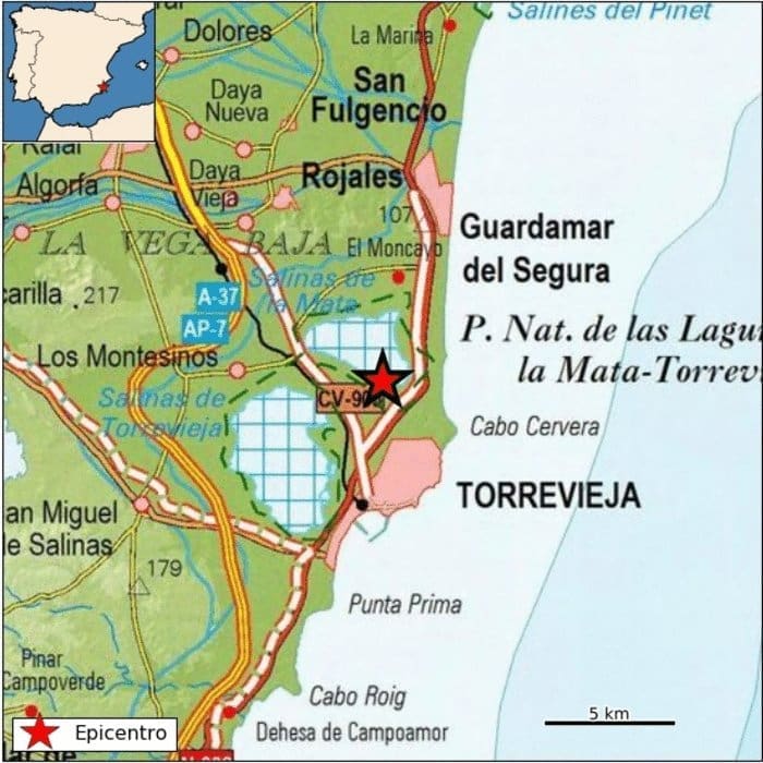 El epicentro del terremoto se ha localizado al norte de la ciudad, justo en la zona sur de la laguna de La Mata, con una profundidad de 10 km.