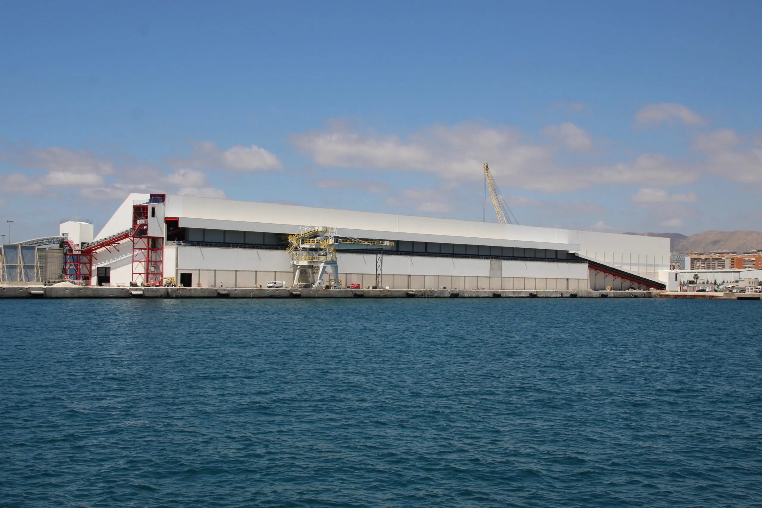 Una vez dentro de la nave, se realizan dos procesos distintos: el apilador se encarga de recibir y almacenar el material entrante, longitudinalmente, desde el nivel superior, mientras que, para transferirlo al buque, es el recuperador el que se desplaza sobre el material almacenado, cargando la mercancía en el circuito de carga hasta una manga telescópica móvil, que lo introduce en bodega del barco. Este elemento clave de la instalación, situada en una franja de 15 metros de ancho del muelle 17, reduce la altura de caída libre de los materiales, minimizando la emisión de polvo durante la carga.