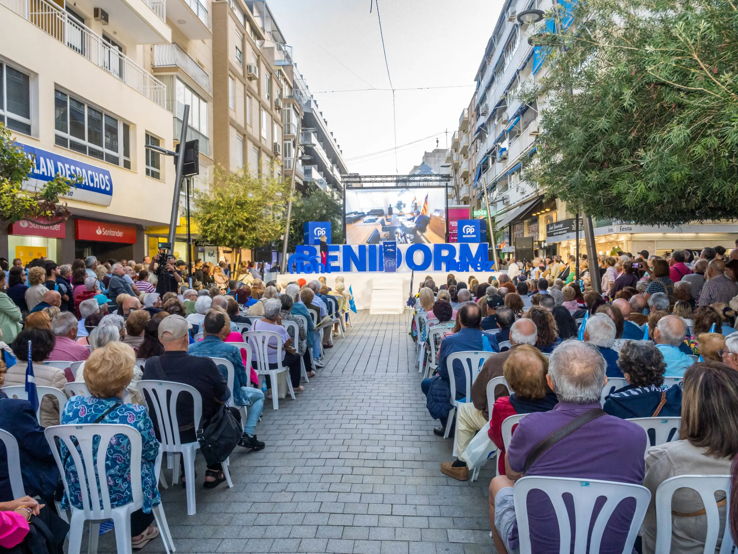 La calle Gambo ha acogido este viernes el mitin de fin de campaña del Partido Popular de Benidorm. Más de 600 personas han acompañado al alcalde y candidato a la reelección, Toni Pérez, en un acto en el que también ha intervenido la presidenta local, y compañera de lista, Mariló Cebreros.