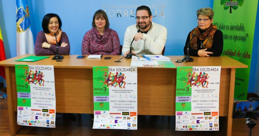 La concejala de ONGs de Torrevieja, Carmen Morate junto al edil de Deportes, Víctor Ferrández, la presidenta de la Asociación de salud integral de mejoras Psicofísica y Psiosicales (ASIMEPP), Maite Miralles, y la secretaria de la misma entidad, Juncal Macho, han presentado la segunda edición de la carrera solidaria a favor de esta asociación que tendrá lugar el domingo 3 de marzo.