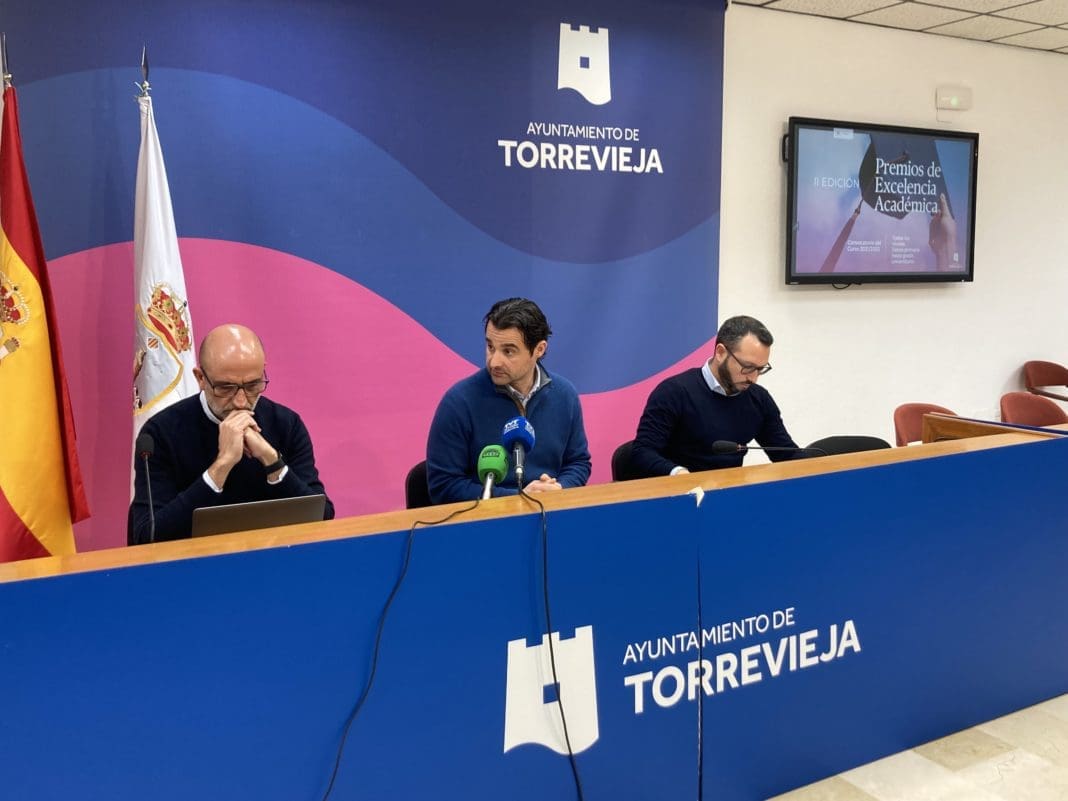 El alcalde de Torrevieja, Eduardo Dolón, acompañado por el concejal de Educación, Ricardo Recuero, y el edil de Juventud, Domingo Paredes, ha presentado en la mañana de hoy las bases de la segunda edición de los Premios a la Excelencia Académica para el curso académico 2021/2022.