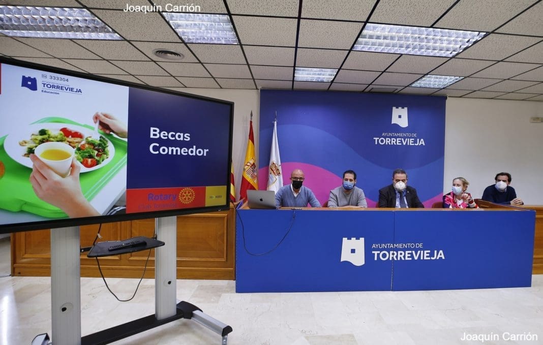 El concejal de Educación del Ayuntamiento de Torrevieja, Ricardo Recuero, el presidente de Rotary Club Torrevieja, Luis Andreu; el representante de la Fundación Humanitaria de los Rotarios Españoles, Ricardo Molina, y la gerente adjunta de AGAMED, Gemma Cruz, han presentado en la mañana de hoy la segunda convocatoria de las Becas Comedor destinadas a niños y niñas de la ciudad que no han podido tener acceso a las becas que otorga la Conselleria de Educación de la Generalitat.