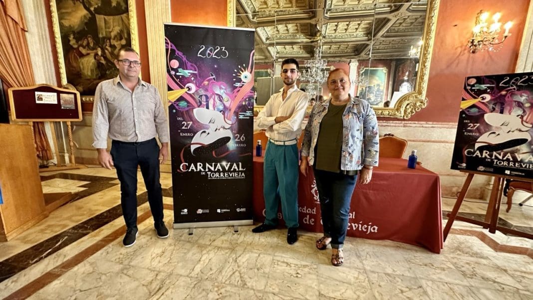 La concejal de Fiestas del Ayuntamiento de Torrevieja, Concha Sala, el presidente de la Asociación Cultural “Carnaval de Torrevieja”, Francisco Pizana, el autor del cartel anunciador 2023, Damián Bear, así como el presidente del Casino de Torrevieja, Miguel Albentosa, han presentado en la mañana de hoy el Carnaval de Torrevieja 2023.