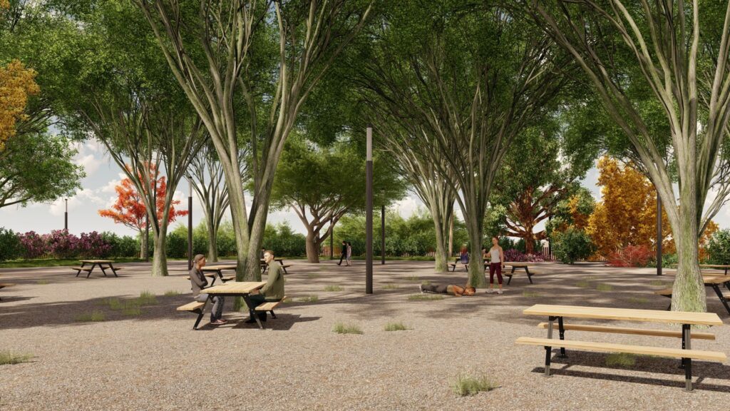 El diseño paisajístico juega un papel clave en el conjunto del parque. En total, se plantarán 537 árboles, como ejemplares de pino carrasco, ciprés, araucarias o jacarandas. Además, estarán acompañados por una amplia y cuidada selección de especies vegetales de bajo consumo hídrico y adaptadas al entorno.
