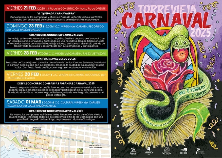 Las calles de Torrevieja son tomadas otro año más por los centros escolares, inundado el corazón de la ciudad con sus disfraces, llenando la ciudad de luz, música y mucho color. Convocatoria a las 16:30 horas en los aledaños del Centro Cultural Virgen del Carmen. Con fiesta fin de desfile, una gran chocolatada y animación.