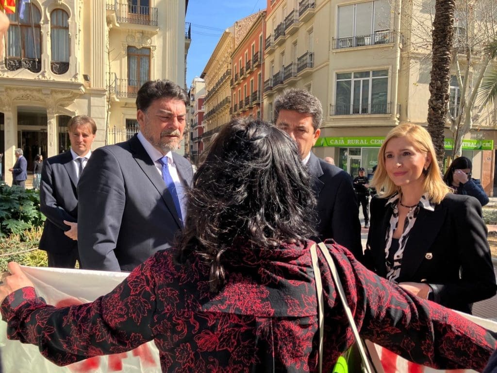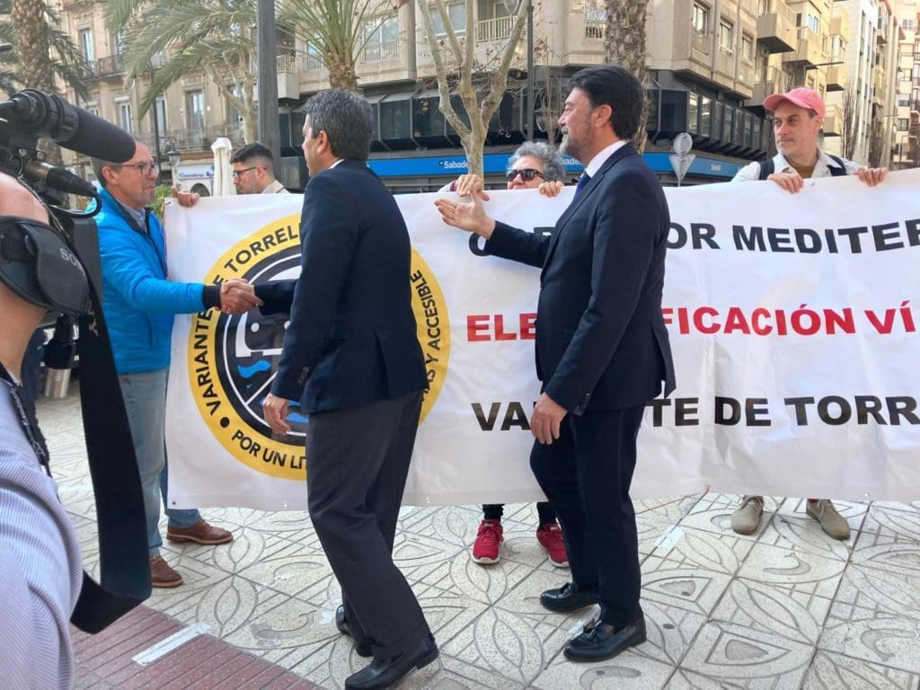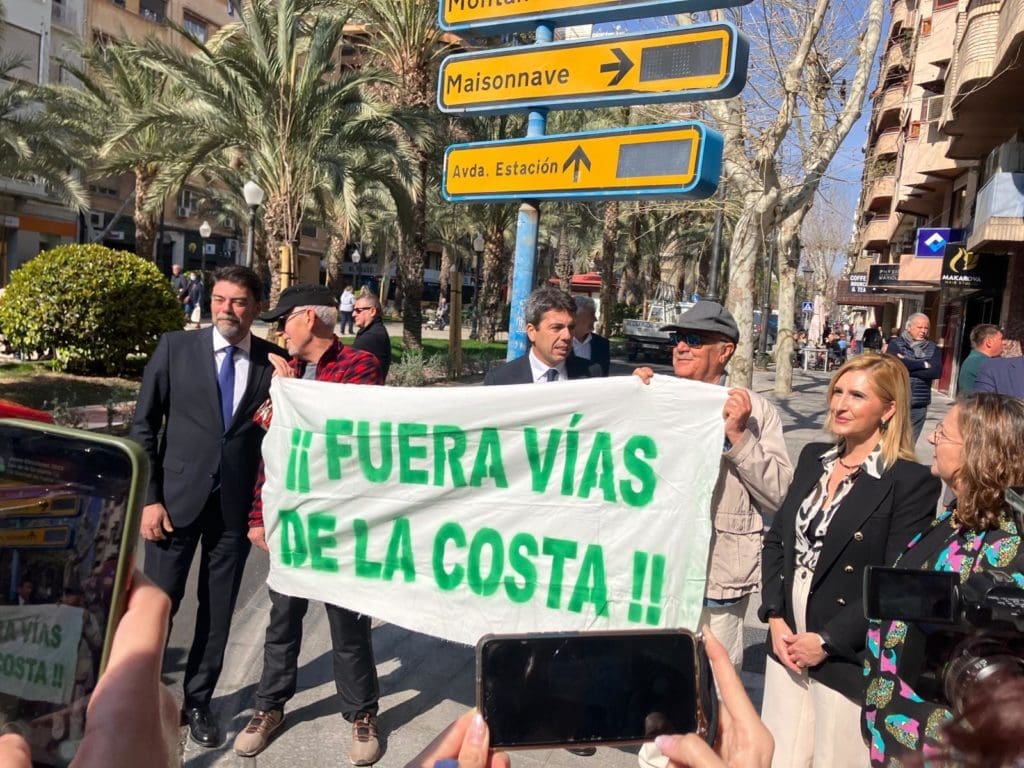 Junto a la puerta de la sede del Consell antes de la firma había varios vecinos de la plataforma Variante de Torrellano, Ya! en contra de las vías en la primera línea de la costa sur de la ciudad y de la electrificación, con los que tanto Mazón como Barcala han conversado brevemente y han apoyado en sus reivindicaciones, que creen que debería atender el Ministerio de Transportes del Gobierno central y Adif.