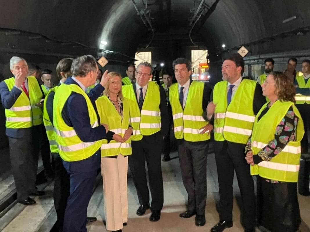 El president de la Generalitat, Carlos Mazón, junto a la consellera de Medio Ambiente, Agua, Infraestructuras y Territorio, Salomé Pradas, el presidente de la Diputación, Toni Pérez, y el alcalde de la ciudad, Luis Barcala, han recorrido los túneles renovados de Luceros tras realizar un breve trayecto, desde la estación de MARQ a Luceros.