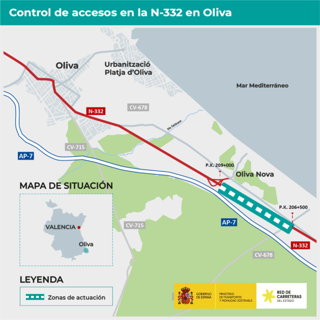 El Ministerio de Transportes y Movilidad Sostenible sigue avanzando en las obras para sustituir y mejorar los accesos en la carretera N-332, entre los km 206,5 y 209, en el término municipal de Oliva, en la provincia de Valencia, que cuentan con un presupuesto de 8,3 millones de euros (IVA incluido).