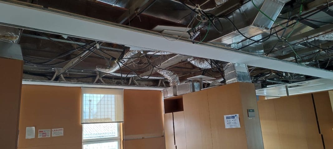 En teoría se arregló según relata UGT, pero tres años después, se ha producido el derrumbe tras detectarse nuevas fisuras a finales de septiembre de este año. Al personal que trabajaba en esta zona se le desplazó a un espacio teóricamente más seguro, «si bien entre su espacio y el afectado mediaba una pieza de pladur». Al personal se le informó que había que realizarse arreglos, pero que «no había ningún problema estructural». Fuentes sindicales recriminan que se tachó de exagerado al personal cuando mostraron su preocupación «y se les sugirió que se pusieran un casco».