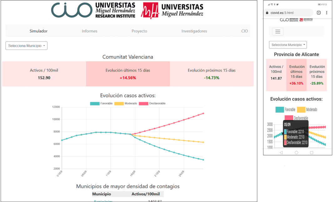 Los investigadores del Instituto Universitario de Investigación ‘Centro de Investigación Operativa’ (CIO) de la Universidad Miguel Hernández (UMH) de Elche José Luis Sainz-Pardo, José Valero y Juan Francisco Monge han desarrollado la primera herramienta de monitorización de la evolución del coronavirus de los municipios en la Comunitat Valenciana. Esta herramienta puede consultarse a través de la dirección web www.ciovid.es, tanto desde ordenadores como desde móviles o tabletas.