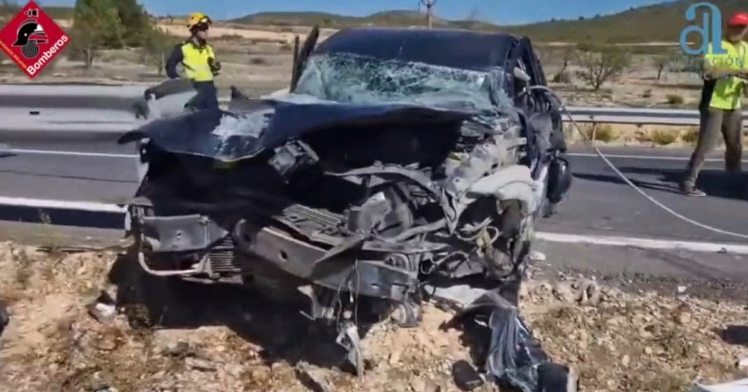 Fin de semana complicado para los bomberos de Villena. Este domingo al mediodía en el kilómetro 171 de la autopista A-7, un vehículo se estrelló contra un guardarrail en un aparatoso choque. A pesar de la violencia del impacto, afortunadamente no se reportaron víctimas ni daños personales significativos.