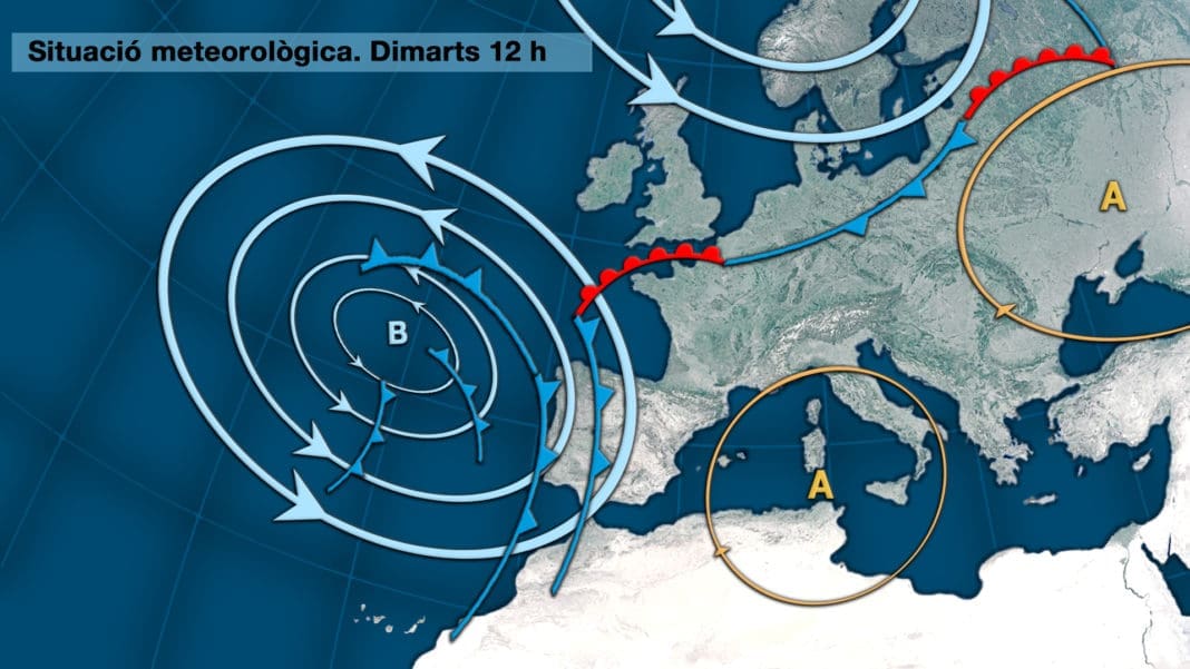 La borrasca enviará franjas de nubes desde el Atlántico que al cruzar la Península irán perdiendo actividad y aquí solo podrán dejar lloviznas débiles por el interior.