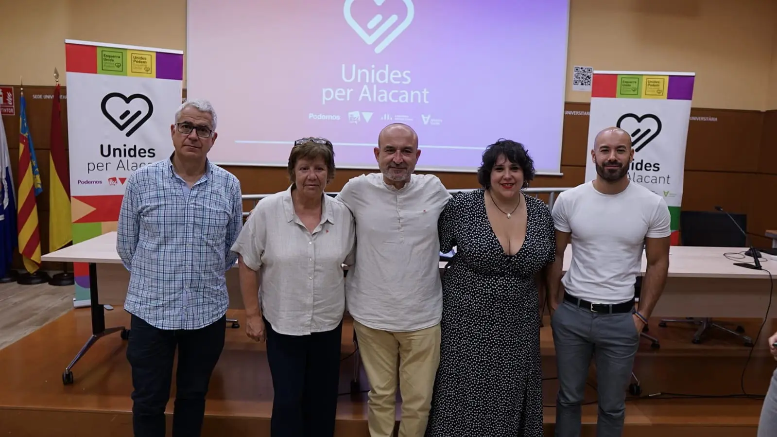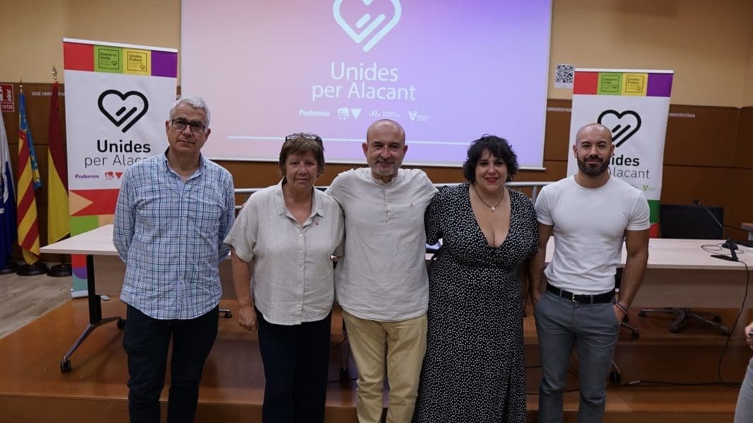 La coalición Unides per Alacant, formada por Esquerra Unida, Unides Podem, ERPV y Alianza Verde, ha presentado este miércoles los principales puntos del programa electoral que la candidatura de confluencia llevará a los comicios del próximo 28 de mayo. Se trata de una batería de propuestas resumidas en 15 puntos que el candidato a la alcaldía, Manolo Copé, junto con los números dos y tres de la lista, los concejales Xavier López y Vanessa Romero; la número 4, Lucía Ibáñez, y el candidato al Ayuntamiento por ERPV, Mikel Forcada, han desgranado esta mañana en la sala Rafael Altamira de la sede universitaria Ciutat d’Alacant.