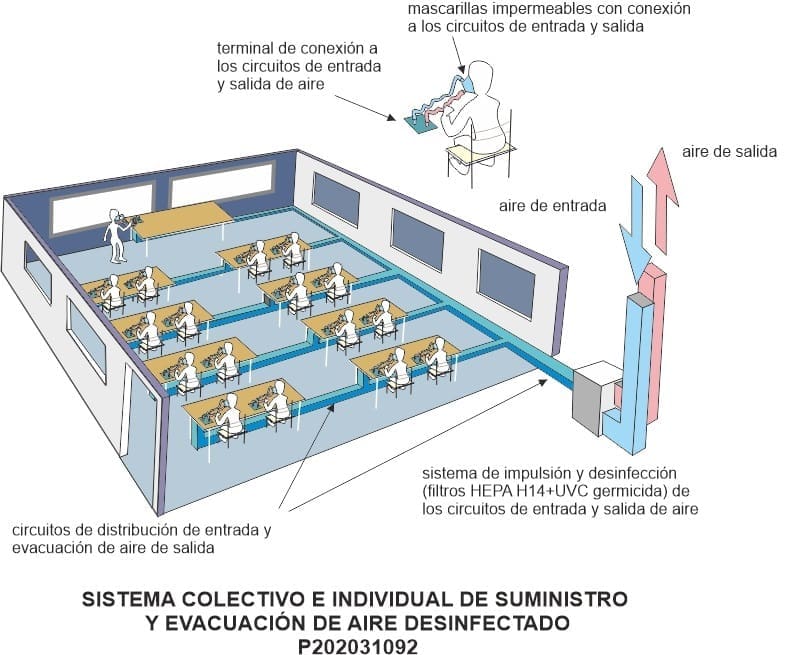 Investigadores del Instituto de Ingeniería de los Procesos Químicos de la Universidad de Alicante han desarrollado un procedimiento que permite el suministro individual de aire desinfectado en espacios cerrados de uso común. Este sistema, ya patentado, consiste en un circuito de circulación de aire donde se pueden conectar una serie de mascarillas individuales.