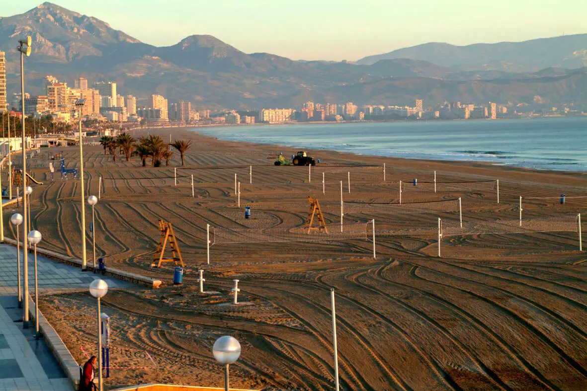 Por la noche, 3 máquinas limpiaplayas realizan la limpieza de la arena y orillas de todas las playas: Urbanova, Postiguet, Albufera y San Juan. Acompañados de un operario que realiza labores de seguridad para evitar posibles accidentes mientras trabajan las máquinas.