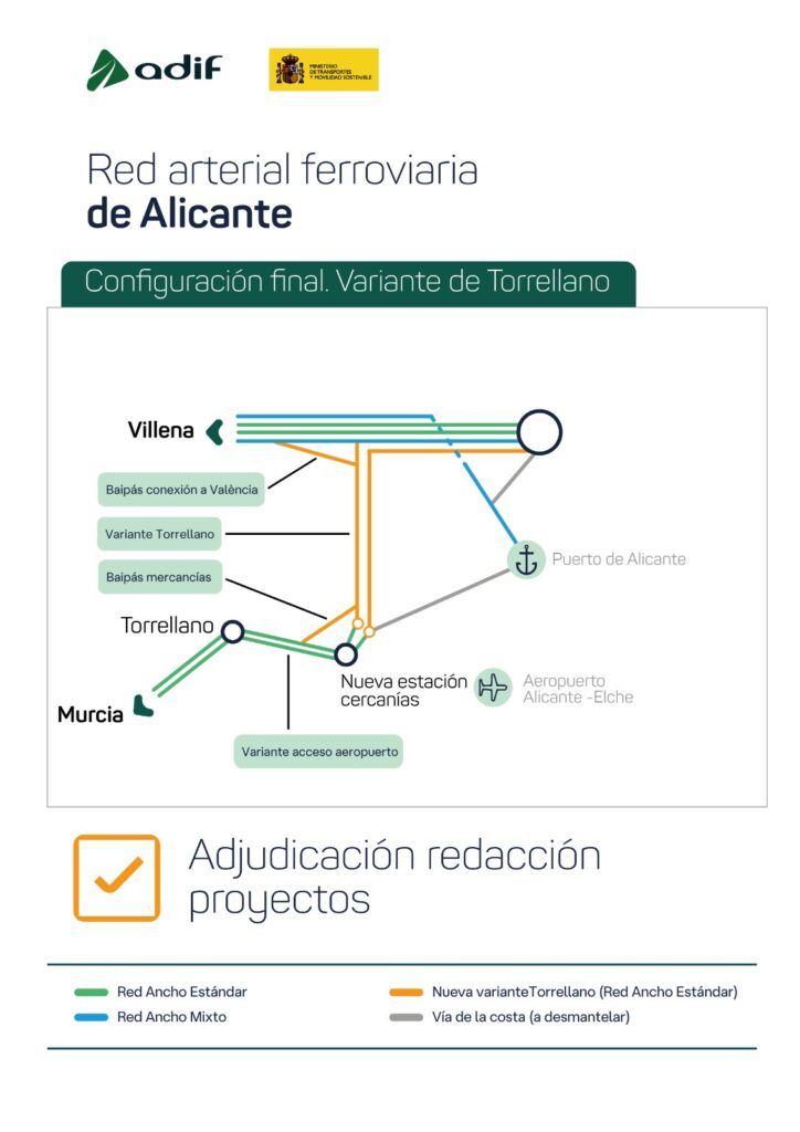 El Ministerio de Transportes y Movilidad Sostenible ha adjudicado por 5,1 millones de euros la redacción de los proyectos de la segunda fase de la variante de Torrellano, una actuación clave para completar la nueva red arterial ferroviaria de Alicante. Este paso permitirá avanzar en la reordenación del sistema ferroviario y en el futuro desmantelamiento de la vía de la costa a su paso por el barrio de San Gabriel.