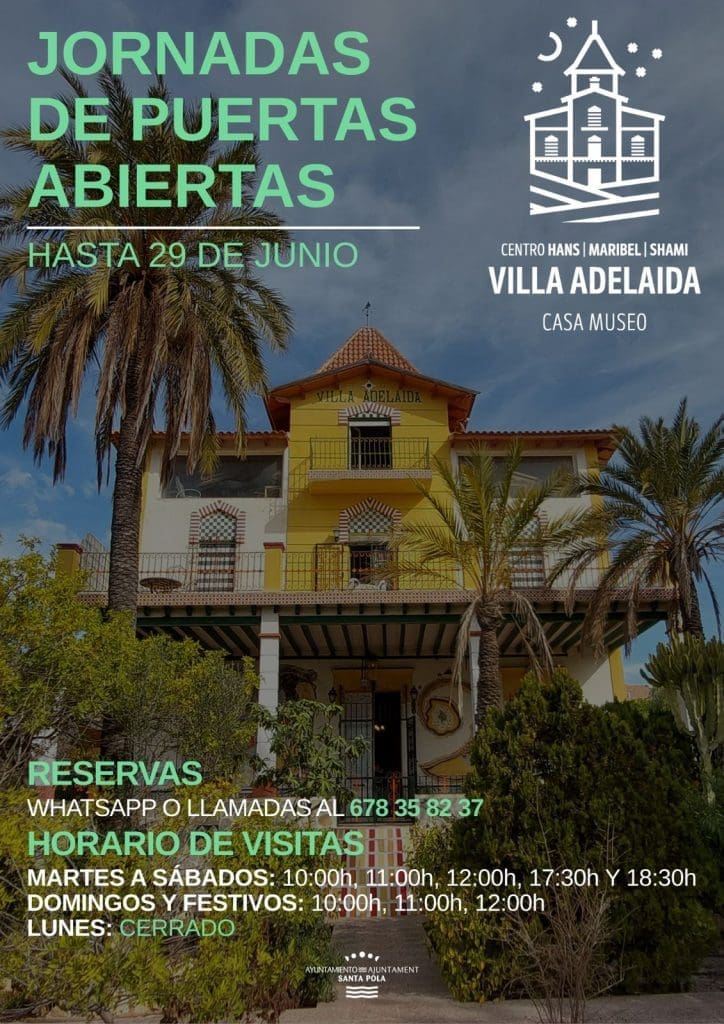 El Centro Hans-Maribel-Shami de Artes, Ciencias y Letras se podrá visitar en el restaurado edificio de Villa Adelaida a partir del próximo martes 29 de abril, merced a unas jornadas de puertas abiertas que el Ayuntamiento de Santa Pola ha programado para que se pueda contemplar la casa museo de forma gratuita hasta el 29 de junio. A partir de esa fecha la casa museo empezará a cobrar una tarifa por la entrada.